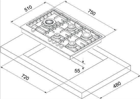 Boretti BGW-75 IX. Productkleur: Zwart, Roestvrij staal, Plaatsing van het apparaat: Ingebouwd, Type kookplaat: Gaskookplaat. Bedieningstype: Draaiknop, Controlepositie: Boven aan de voorkant. Afmetingen: Breedte 750 mm, Diepte 510 mm, Hoogte 55 mmZwart, Roestvrij staal Ingebouwd