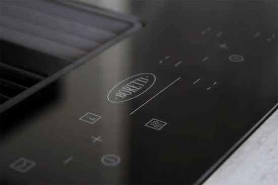 Deze hedendaagse inductiekookplaat biedt de perfecte combinatie: een geïntegreerd afzuigsysteem én flexibele kookzones. Hierdoor kunnen de kookzones samengevoegd worden tot een uitgestrekt kookoppervlak, zonder dat een traditionele afzuigkap nodig is. De afzuiging heeft verplaatsbare vetfilters die na gebruik in de vaatwasser gereinigd kunnen worden. Tevens is het mogelijk om de Boretti PURO Quadro plasmafilters te installeren voor luchtrecirculatie.