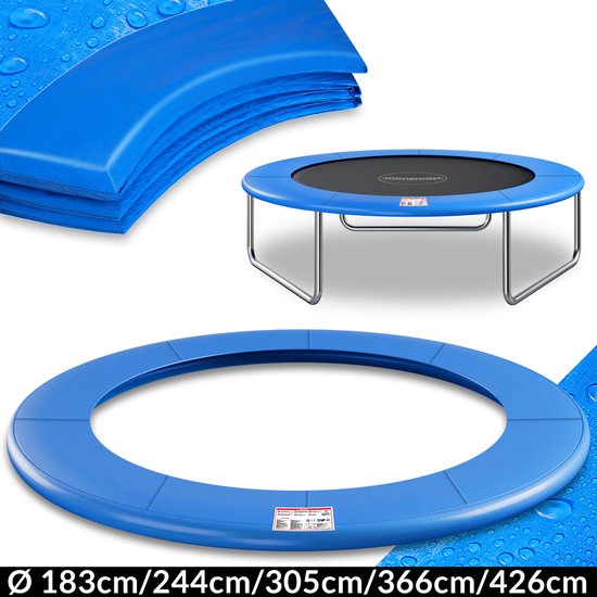 Deze beschermrand met 15 mm dikke vulling bedekt de veren en stangen, zodat jouw kind veilig kan springen. De lichtbestendige, dikke PVC heeft een lange levensduur. De vulling is net zo breed als de gehele rand. Geschikt voor trampolines met de volgende diameter - Kies! Ø 183 cm - 244 cm - 305 cm - 366 cm - 426 cm Productvoordelen: Lichtbestendig en dik PVC aan beide kanten, Vulling met een hoge dichtheid, De vulling beschermt tegen de veren en stangen, 15 mm doorlopende dikke vulling, Gemakkelijk te reinigen Technische specificaties: Afmetingen: diameter 183 cm, 244 cm, 305 cm, 366 cm, 426 cm; (bxh) 30x10 cm Vulling dikte: 15 mm Materiaal: polyvinylchloride Kleur: blauw Leveringsomvang: 1x trampoline veerhoes naar keuze - de afgebeelde trampoline is niet bij de levering inbegrepen