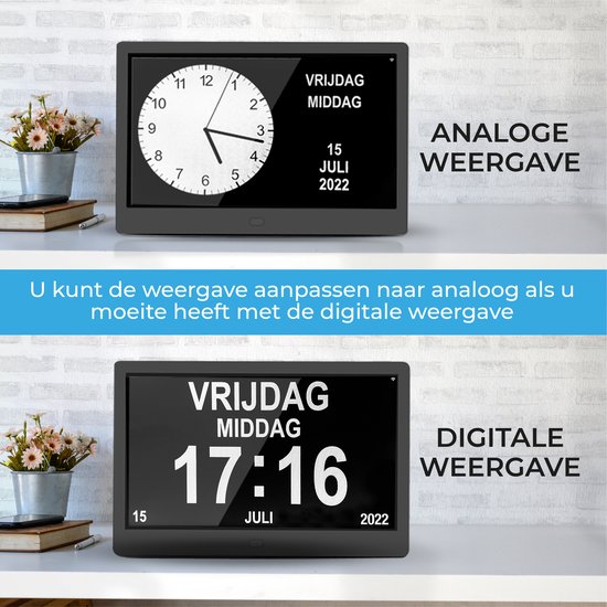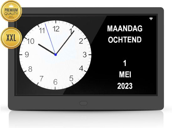 Seniorenklok voor dementie en Alzheimer met een extra groot scherm en letters voor optimale leesbaarheid; toont tijd, dag en datum; zowel analoog als digitaal; deze kalenderklok is uitgerust met uitgebreide alarmfuncties en is wifi-compatibel.