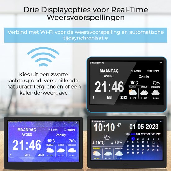 Daarnaast is er de optie om de klok te verbinden met uw wifi-netwerk, zodat u toegang heeft tot een speciale digitale weergave met weersvoorspellingen. U hoeft de datum en tijd niet meer handmatig in te stellen; de klok regelt dat automatisch voor u!