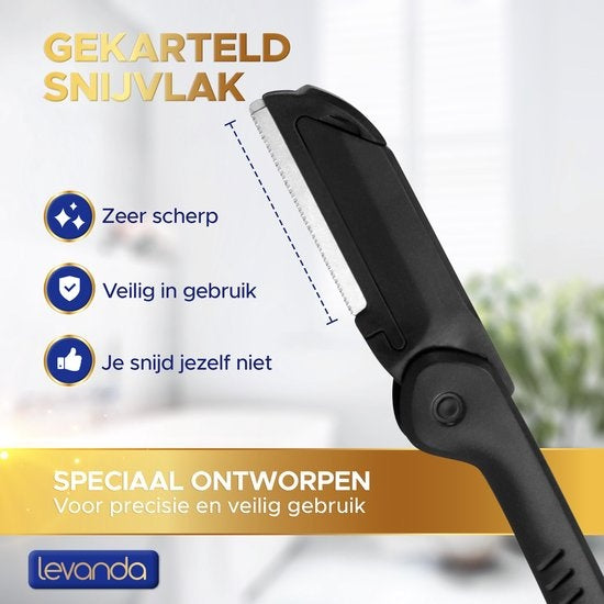 Het levanda wenkbrauw scheermesje is speciaal ontworpen zodat iedereen makkelijk en met grote precisie kan trimmen als een professional. Nu kunnen je wenkbrauwen er altijd uitzien alsof je net bij de schoonheidsspecialiste bent geweest. Door het compacte pen design ligt de levanda wenkbrauw trimmer op een natuurlijke manier in de hand. De inklapbare houder kan je makkelijk en veilig overal mee naar toe nemen.