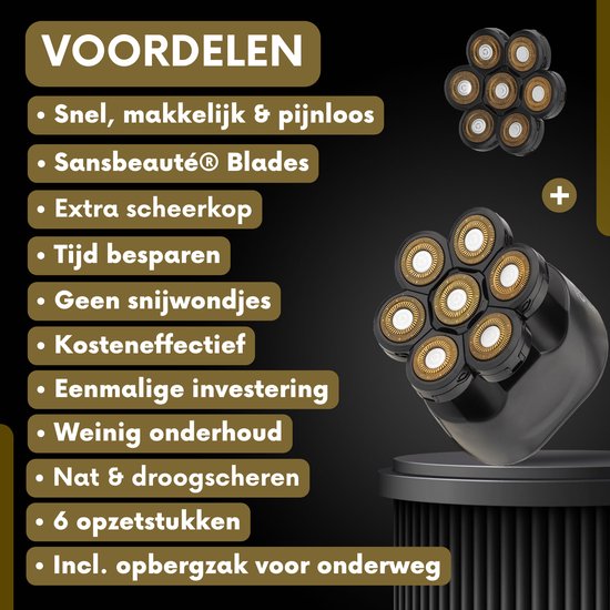 ✓ Flexibele scheerkop – Met 7 (!) ronde scheerkoppen biedt het scheerapparaat van Sansbeauté® een uitgebreider scheeroppervlak, zodat er meerdere haartjes in één keer worden meegenomen. De zeven flexibele 7D scheerbladen bewegen soepel over je kin, schedel en wangen; eenvoudiger kan het bijna niet!