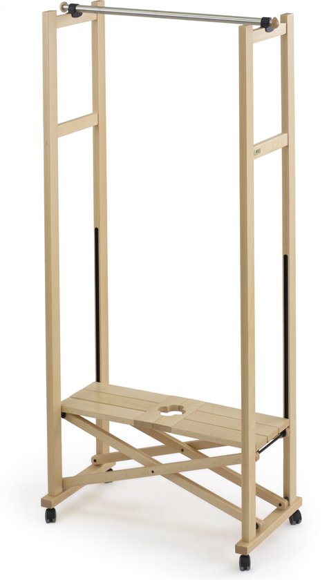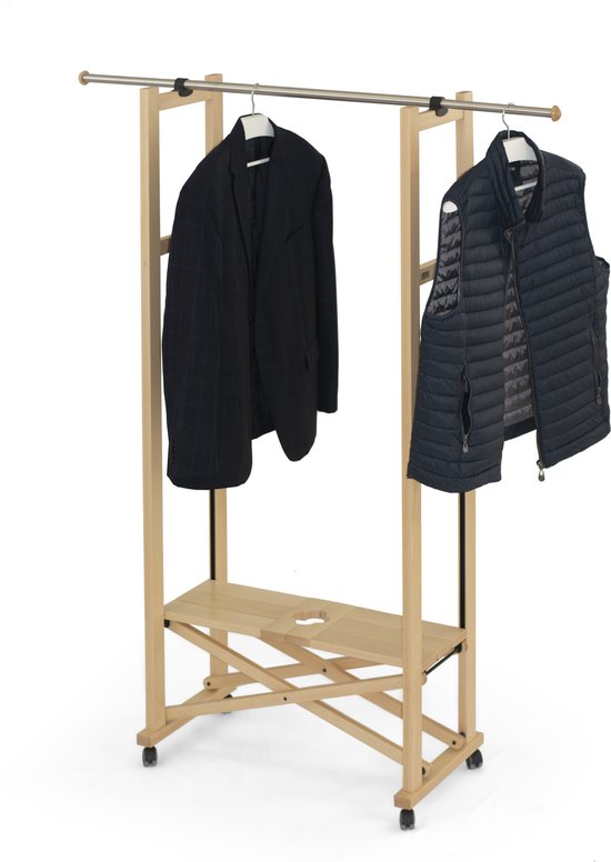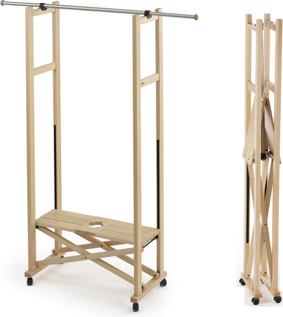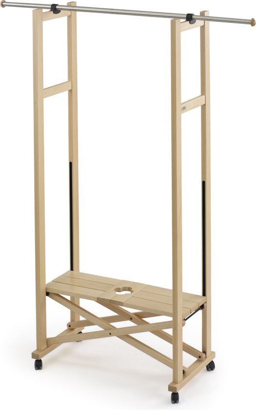 Kledingrek ELIOS - uitschuifbare stang met een bereik van 78 tot 140 cm - centrale plank gemaakt van massief beukenhout - Kleur: naturel