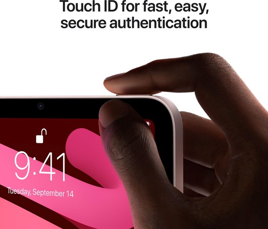 Touch ID is geïntegreerd in de bovenste knop, waarmee je de iPad veilig en eenvoudig ontgrendelt met je vingerafdruk. Ook kun je hiermee veilig betalingen doen.