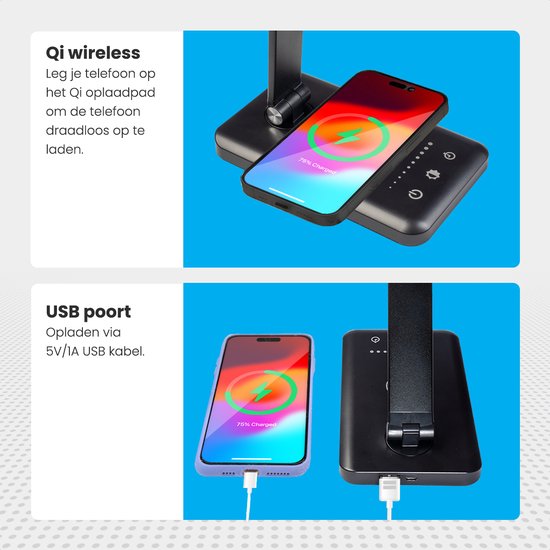 Te weinig stopcontacten om de LED lamp en je smartphone in te pluggen? Dan kan je je smartphone gewoon via de lamp opladen. Leg je smartphone op het Qi oplaadpad om hem draadloos op te laden. Je kan hem ook via een micro USB-kabel aansluiten op de USB-poort op de voet van de lamp. Zo kan jij je aandacht volledig bij je werk houden of lekker ontspannen.