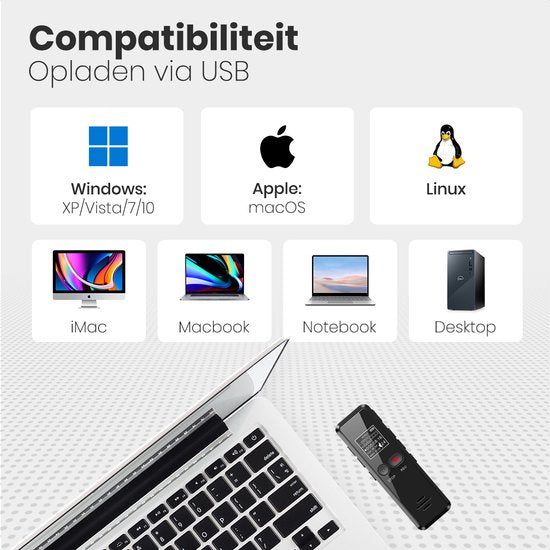 Je kunt de voicerecorder opladen via de micro USB-aansluiting. Zeer praktisch, geen gedoe met batterijen! De interne opslag functioneert als een USB-flashdrive. Met een USB-kabel kun je eenvoudig bestanden overzetten naar een externe harde schijf, laptop of Macbook. Of voeg juist bestanden zoals muziek toe aan de voice recorder, zodat je deze als een MP3-speler kunt benutten!