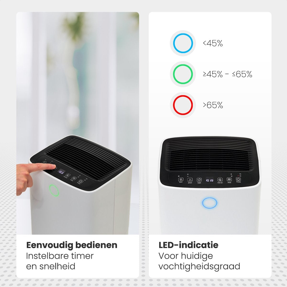 Dankzij de LED-indicator kun je eenvoudig de vochtigheidsgraad van je ruimte volgen. De ontvochtiger geeft met groen, geel en rood aan of de luchtvochtigheid op het juiste niveau is. Groen betekent dat de luchtvochtigheid optimaal is, geel geeft aan dat het tijd is om te ontvochtigen en rood waarschuwt voor een te hoge luchtvochtigheid. De slimme instellingen maken het eenvoudig om de ontvochtiger te bedienen via de knoppen en de timerfunctie.