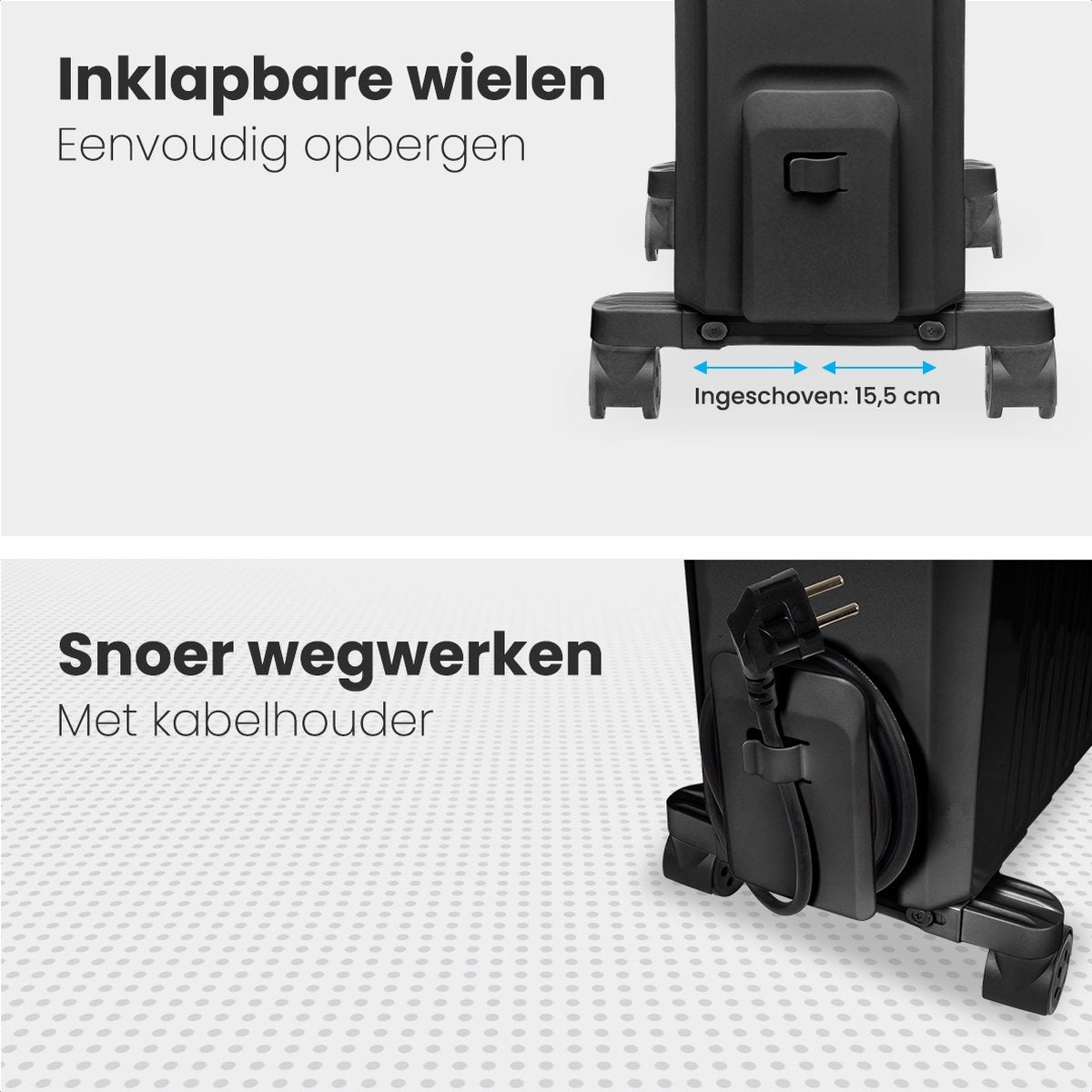 De olieradiator is zeer compact en beschikt over 4 wielen. Hierdoor kun je hem dus gemakkelijk door het huis of kantoor verplaatsen. Als de radiator eenmaal op zijn plek staat kun je de wielen eenvoudig inklappen. Zo staat hij stevig en geniet jij van de heerlijke warmte!