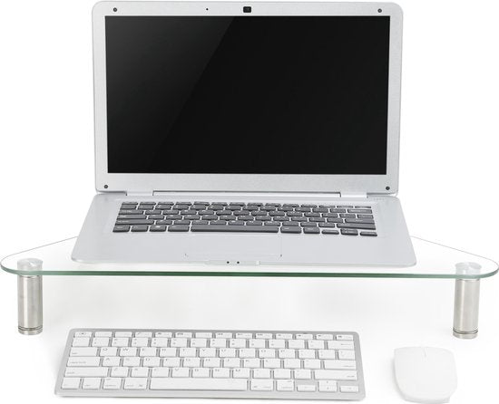 Een stijlvolle, stevige en praktische design monitorverhoger in een driehoeksvorm, voorzien van aluminium poten die in hoogte verstelbaar zijn van 7,5 cm tot 9 cm. De bovenkant is gemaakt van veiligheidsglas. Dit driehoekige model is perfect voor elk bureau of tafel en voegt een aantrekkelijk element toe aan elk interieur. Bespaar ruimte door uw monitor of beeldscherm in de hoek te plaatsen. Het maximaal toelaatbare gewicht bedraagt 20 kilo. De afmetingen zijn 50 cm breed, 28 cm diep en een hoogte van 7,5 cm tot 9 cm.
