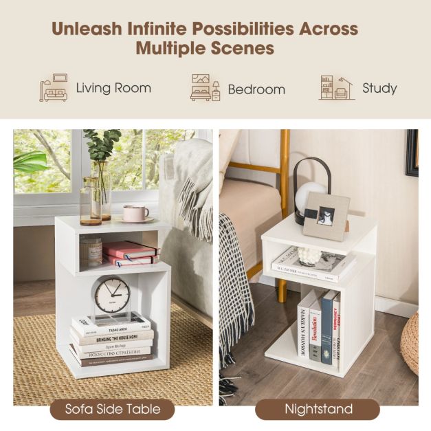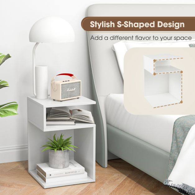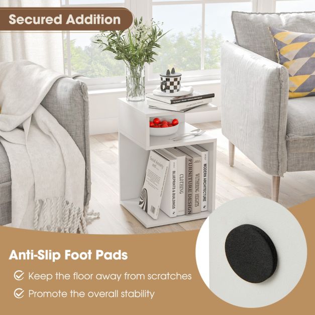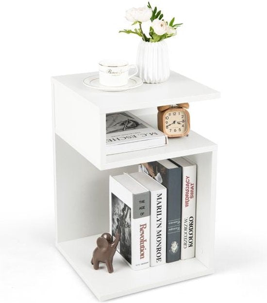 Bijzettafel 'S'-Vormige Woonkamerbank Bijzettafel met 2 Open Kluisjes Kleine Salontafel met Geometrisch Design Wit