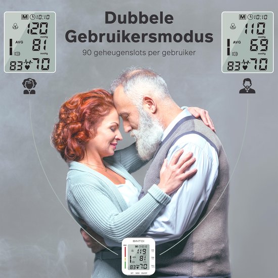 De meetresultaten worden automatisch opgeslagen in het geheugen van de polsbloeddrukmeter, met daarbij de datum en het tijdstip van de meting.Deze polsbloeddrukmeter is geschikt voor het gebruik door twee personen, waarbij elk toestel tot 90 metingen per persoon kan opslaan in het geheugen. Dit maakt het niet alleen een uitstekende keuze voor thuisgebruik, maar ook perfect om uw bloeddruk tijdens reizen te monitoren, of om recente resultaten met uw (huis)arts te bespreken.