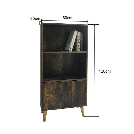 Een robuuste en stabiele kast die veelzijdig kan worden ingezet als boekenplank, wandmeubel, dressoir of opbergoplossing. Dit vintage bruine wandmeubel beschikt over twee open vakken van 60 cm breed, met daaronder een afsluitbare sectie met twee deuren voor het verbergen van spullen die je liever niet in het zicht hebt. Deze kast past perfect in elk interieur en elke ruimte binnen je huis of op kantoor en biedt tal van opbergmogelijkheden om je boeken, items of verzamelingen tentoon te stellen. De afmetingen zijn 120 cm hoog, 60 cm breed en 30 cm diep. Bij de levering zijn ook montage-instructies en de benodigde materialen inbegrepen.
