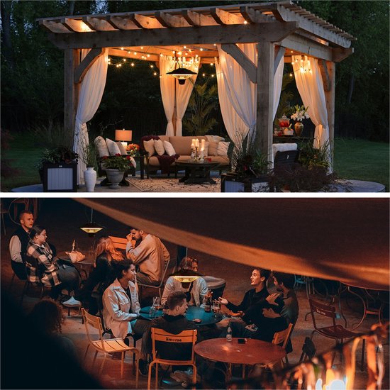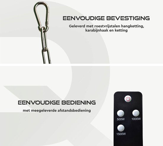 Door de meegeleverde ophangbeugels kunt u het apparaat eenvoudig installeren.Een stalen ketting met karabijnhaak maakt het eenvoudig en veilig om de terrasverwarmer op te hangen. Dit slimme ophangsysteem garandeert dat de heater stevig op zijn plaats blijft, terwijl de elegante zwarte poedercoating een moderne look toevoegt. Perfect voor iedereen die functionaliteit en stijl wil combineren.