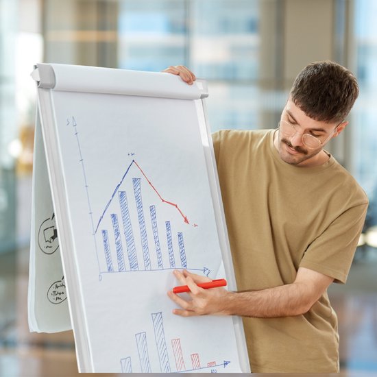 Alles wat je nodig hebt, is inbegrepen: een pennengoot voor je markers, een whiteboardwisser, 4 gekleurde whiteboardmarkers, gekleurde magneten en een blok flipoverpapier met 25 vellen. Geen gedoe, je kunt meteen beginnen, zo eenvoudig is het. De flipover is bovendien licht (4,5 kg) en gemakkelijk te verplaatsen, perfect wanneer je snel wilt wisselen van ruimte op kantoor of tijdens je training.