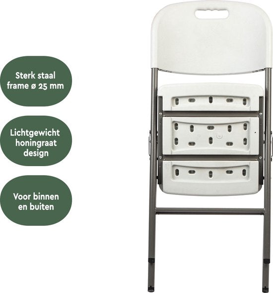 Dankzij het handige stapelbare ontwerp passen meerdere klapstoelen moeiteloos op elkaar, waardoor ze zeer weinig ruimte innemen. Perfect voor gebruik in de keuken, garage, opslagruimte of wachtruimte. Na gebruik klap je de stoel eenvoudig weer in en opbergen gaat heel makkelijk.