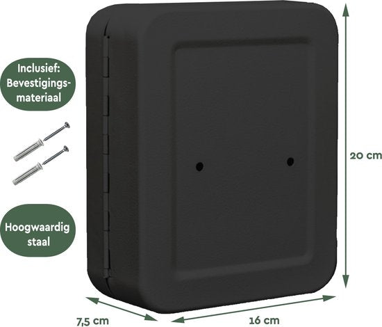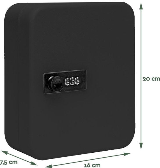 Deze sleutelkluis is vervaardigd uit metaal, wat bijdraagt aan een veilige en duurzame opslag van jouw sleutels. De sleutelkluis heeft een elegante zwarte afwerking. Deze sleutelkast kan eenvoudig worden vergrendeld met het codeslot, wat het mogelijk maakt dat meerdere personen toegang hebben tot de essentiële sleutels zonder dat er extra sleutels nodig zijn.
