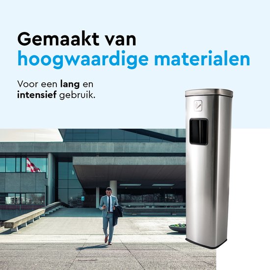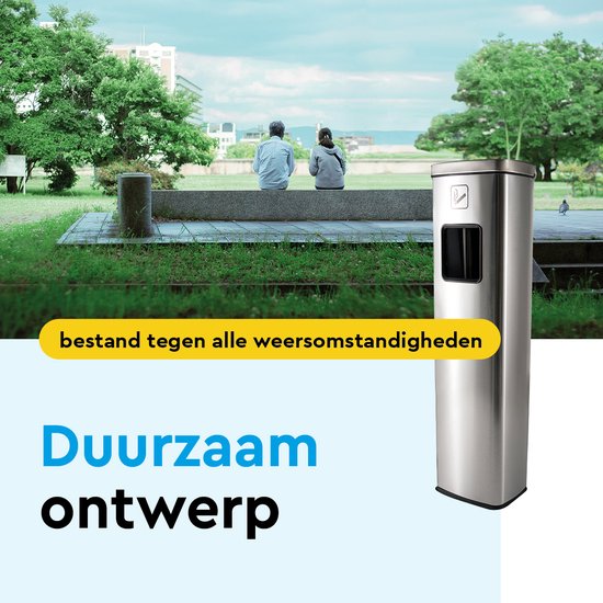 Door het verzamelen van afval en sigarettenpeuken draagt deze staande asbak bij aan een schone buitenruimte. Het is een duurzame en veilige optie die een goede indruk achterlaat bij zowel bezoekers als klanten.