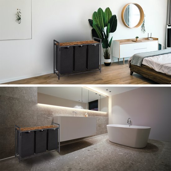 BRASQ Wasmand 3 vakken - Wassorteerder 114 Liter - Uitschuifbaar met Plank 92,5x33x71 cm - Wasbox Zwart Metaal - Bruin hout - Basket