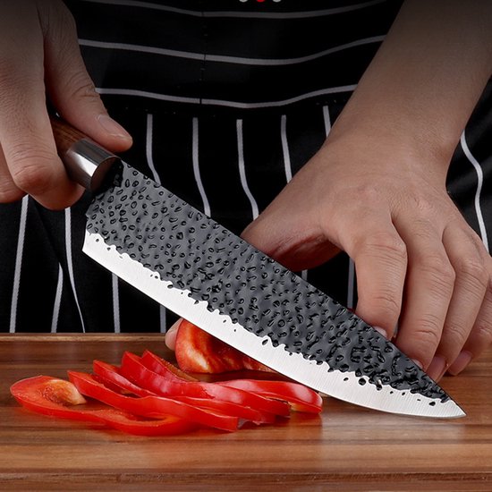 Dit robuuste mes is grotendeels handgemaakt en op traditionele wijze gesmeed, wat zorgt voor het mooie en unieke ontwerp van het mes. Het koksmes is vervaardigd uit superhard staal. Het handvat is gemaakt van prachtig, duurzaam hout met karakter.