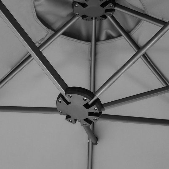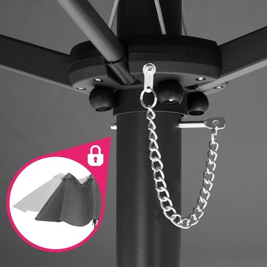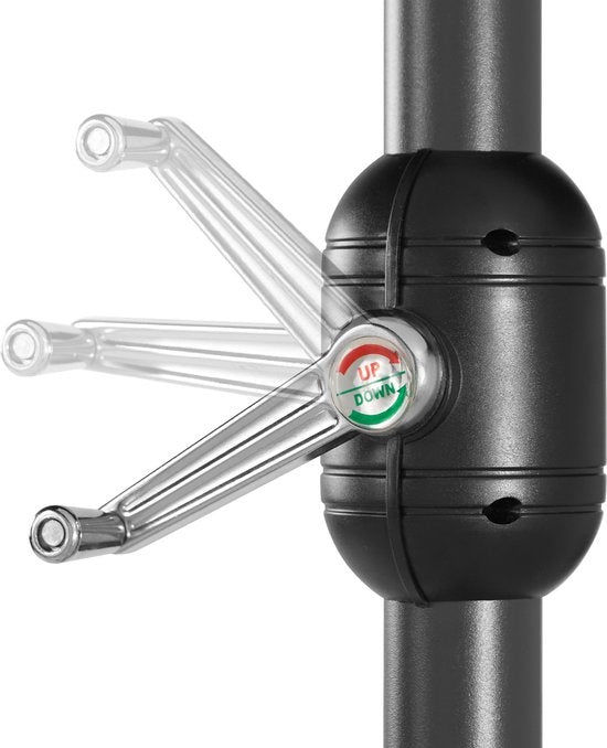 Groot parasoloppervlak Stevig en stabiel Met zwengel om te openen Vast staande mast Goede luchtcirculatie