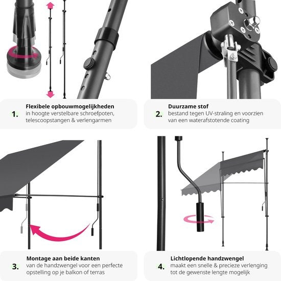 Geniet van een koele zomer met de multifunctionele klemluifel van tectake. Dankzij de eenvoudige en stabiele schroeftechniek is de flexibele constructie binnen korte tijd klaar voor gebruik, zonder dat je hoeft te boren of te schroeven. Met de soepel draaiende handzwengel kun je de zonwering precies uitschuiven tot de gewenste lengte, en indien nodig zelfs verticaal als effectieve privacybescherming. Naast zijn uitstekende UV-bestendigheid is het weerbestendige polyesterweefsel extreem duurzaam en volledig waterafstotend. Breng gezellige uren door op je balkon of terras onder het comfortabele uitvalscherm van tectake.