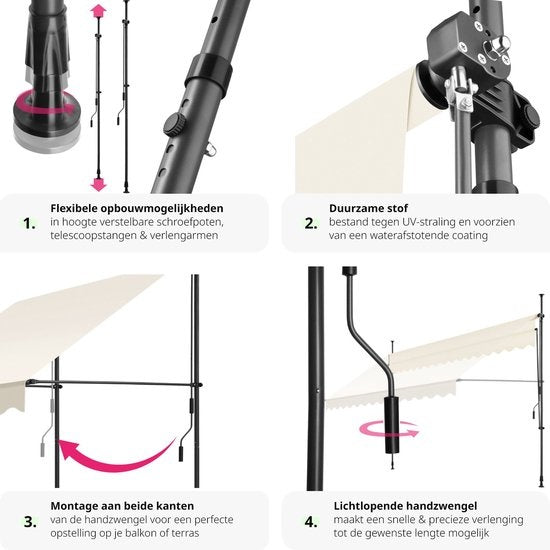 Geniet van een koele zomer met de multifunctionele klemluifel van tectake. Dankzij de eenvoudige en stabiele schroeftechniek is de flexibele constructie binnen korte tijd klaar voor gebruik, zonder dat je hoeft te boren of te schroeven. Met de soepel draaiende handzwengel kun je de zonwering precies uitschuiven tot de gewenste lengte, en indien nodig zelfs verticaal als effectieve privacybescherming. Naast zijn uitstekende UV-bestendigheid is het weerbestendige polyesterweefsel extreem duurzaam en volledig waterafstotend. Breng gezellige uren door op je balkon of terras onder het comfortabele uitvalscherm van tectake.