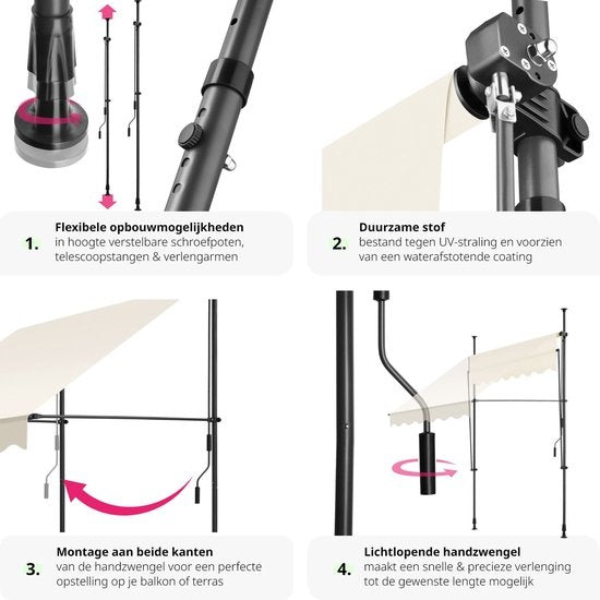 Geniet van een koele zomer met de multifunctionele klemluifel van tectake. Dankzij de eenvoudige en stabiele schroeftechniek is de flexibele constructie binnen korte tijd klaar voor gebruik, zonder dat je hoeft te boren of te schroeven. Met de soepel draaiende handzwengel kun je de zonwering precies uitschuiven tot de gewenste lengte, en indien nodig zelfs verticaal als effectieve privacybescherming. Naast zijn uitstekende UV-bestendigheid is het weerbestendige polyesterweefsel extreem duurzaam en volledig waterafstotend. Breng gezellige uren door op je balkon of terras onder het comfortabele uitvalscherm van tectake.