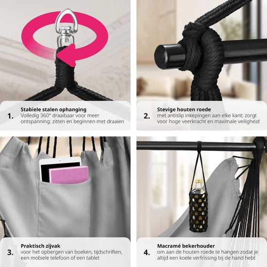 tectake® Hangstoel voor binnen of buiten - Weerbestendig - Met tabletvak en bekerhouder - Macramé schommel voor balkon en tuin - Hangende schommel belastbaar tot 150 kg - Grijs