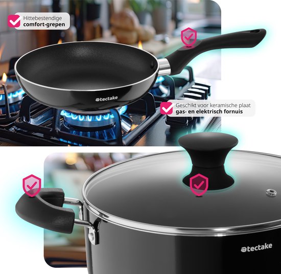 De anti-aanbaklaag zorgt ervoor dat er niets aanbrandt en de schoonmaak razendsnel is voltooid. De ergonomische en hittebestendige kunststof handgrepen liggen comfortabel in de hand en waarborgen een veilige gebruikservaring. Gemaakt van sterk, roestvrij aluminium verzekert de pannenset een gelijkmatige warmteverdeling en dus de beste kookresultaten.