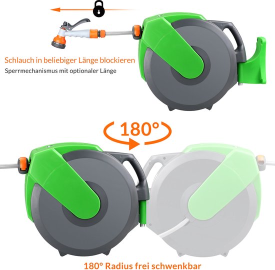 De slanghaspel met een geïntegreerde wandsteun kan eenvoudig aan de muur worden bevestigd. Dankzij de automatische oprol- en afrolfunctie kan de slang snel naar de gewenste lengte worden getrokken en desgewenst weer opgerold. Hierdoor hoef je nooit meer handmatig de slang op te rollen!