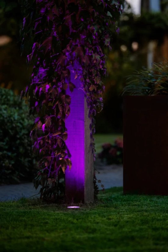 Deze inbouw grondspot met Garden Lights, Zigbee 12V van Rubum, biedt 5W en 280Lm RGBW verlichting. Verkrijgbaar via bol.com en eenvoudig te installeren met de meegeleverde grondbuis. Pas de lichthoek aan met de flexibele smart lichtbron en verbind de spot met de Smart Life app. Door de Rubum SMART (Zigbee) aan een zone te koppelen, kun je de gewenste sfeer creëren. Via de app is het mogelijk om de lamp te dimmen en de lichtkleur in te stellen, variërend van warm wit tot koel wit of in elke andere kleur, zoals geel, blauw of rood. Dit maakt het eenvoudig om een romantische of feestelijke ambiance te creëren, afhankelijk van jouw voorkeur! Sla je favoriete instellingen op als scène zodat je elke avond weer kunt genieten van je tuin.