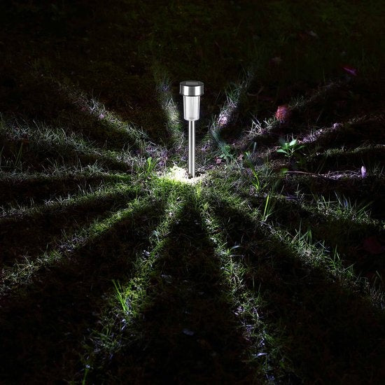 De weerbestendige solarlamp (beschermingsklasse IP44) van roestvrij staal wordt overdag door zonlicht opgeladen. Het schakelt dankzij de schemeringssensor automatisch aan zodra de schemering invalt en zorgt zo tot 8 uur lang voor een geweldige lichtsfeer in jouw tuin. Het aangename witte LED licht zorgt voor een sfeervolle ambiance in jouw tuin. Dankzij de grondpen kun je de solarlamp gemakkelijk in de grond steken en accenten zetten in jouw tuin, terras of balkon. Dankzij de draadloze solartechnologie kun je jouw creativiteit de vrije loop laten een stopcontact heb je dus niet nodig