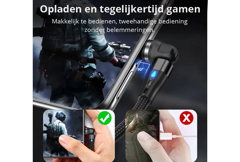 De innovatieve 540° roterende connector biedt ongekende bewegingsvrijheid. Of je nu ligt, zit of beweegt tijdens het opladen, je toestel blijft comfortabel in gebruik. Laat de magnetische aansluiting in je toestel zitten en klik de kabel er in één soepele beweging op — geen gepruts meer, ook niet in het donker.