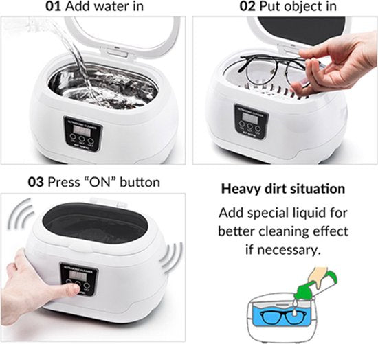 De ultrasone reinigingstechnologie maakt gebruik van geluidsgolven om vuil en olie op te lossen van verschillende objecten. Door de sterke 35 W motor en de gebruiksvriendelijke timer, wordt al het vuil in een paar minuten grondig verwijderd. Perfect voor dagelijks gebruik of voor het intensief reinigen van hardnekkige vlekken. Voor nog betere resultaten kun je een paar druppels afwasmiddel toevoegen.
