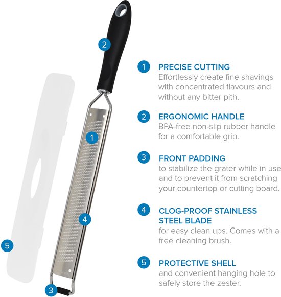 - Moeiteloos raspen - Dankzij het scheermesachtige precisiesnijwerk van onze microrasp kunt u razendsnel extra fijne krullen maken met een geconcentreerde smaak. Je citroenschil zal uitsluitend de gekleurde schil bevatten, zodat het bittere merg achterblijft.