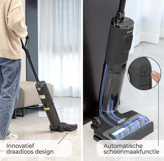 Deze geavanceerde vloerreiniger combineert stofzuigen en dweilen in één apparaat. Dankzij de aparte tanks voor schoon- en vuil water (485ml en 400ml) wordt elk oppervlak grondig en hygiënisch gereinigd zonder moeite. Perfect voor dagelijks gebruik.