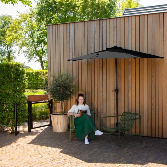 - De halfronde vorm maakt het mogelijk om de parasol direct tegen de muur te plaatsen. Perfect voor balkons, patio's, terrassen of kleine tuintjes.