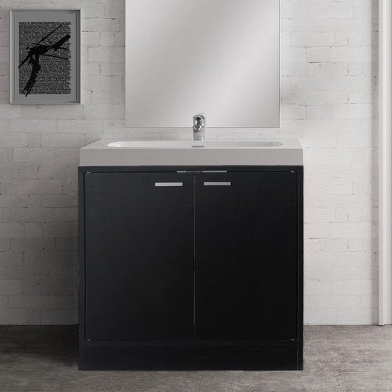 Dit zwarte badkamermeubel is ontworpen om ruimte te besparen en biedt voldoende opslagruimte om uw badkamer georganiseerd te houden. Deze onderkast, bedoeld voor plaatsing onder de wastafel, is perfect voor elke badkameromgeving. Het meubel beschikt over twee openslaande deuren die toegang geven tot een royale opbergruimte en een legplank. Dankzij het melamine oppervlak is dit badkamermeubel uiterst makkelijk schoon te maken en minder kwetsbaar voor vocht. Houd er rekening mee dat de levering geen wastafel, kraan of spiegel omvat en de hoogte bedraagt 60 cm. Wanneer de wastafel hoger aan de muur is gemonteerd, kan er een open ruimte tussen de wastafel en de onderkast ontstaan. Kleur: zwart. Afmetingen: hoogte 60 cm, breedte 60 cm, diepte 30 cm. De levering bevat een handleiding en alle benodigde montagematerialen.