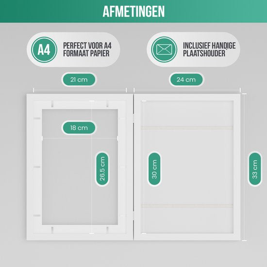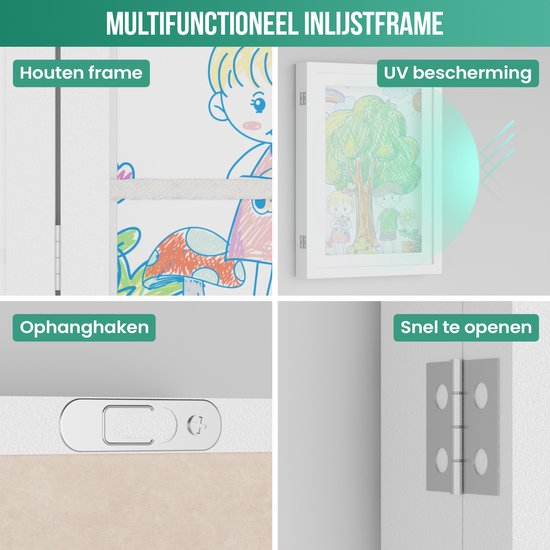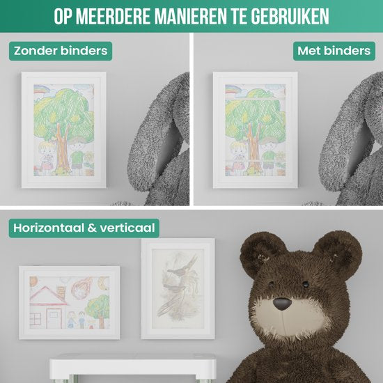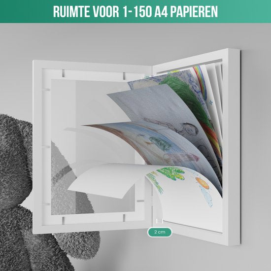 Krijg jij ook dagelijks de allermooiste creaties van jouw kinderen? En belandt de ene kindertekening na de andere aan de muur, op de koelkast of stiekem in de prullenbak? Dan heb je deze houten kinderkunstwerklijst van Avalo nodig! Deze witte A4 display van 33x24x3.5 CM is namelijk perfect om ontzettend veel kindertekeningen in te lijsten. Je hoeft niet langer oude tekeningen weg te moffelen, je plaatst gewoon de nieuwste tekening over de vorige heen. Zo geniet je op elk moment weer van een ander kunstwerkje. Hoge kwaliteit en uniek ontwerp Deze witte lijst voor tekeningen beschikt over een hoge kwaliteit. Het A4 display is namelijk gemaakt van hoogwaardig glanzend acryl en een milieuvriendelijk MDF-kader. Daarnaast beschikt de box frame lijst over witte elastische bandjes met metalen pinnetjes om alle tekeningen in de lijst te stabiliseren. Dankzij het slimme ontwerp kan je via de voorkant de kunstwerken snel toevoegen en wisselen. Meer dan voldoende ruimte Dit A4 display van Avalo is een kinderkunstwerklijst voor veel tekeningen. Er kunnen namelijk tot 150 kunstwerken in! De exacte hoeveelheid hangt uiteraard af van de dikte van het papier. Hoe dunner de kindertekeningen of kunstwerken zijn, hoe meer er in de box frame lijst passen. Op te hangen en neer te zetten Deze kinderkunstwerklijst van Avalo is eenvoudig op te hangen aan de muur, maar je kan hem ook neerzetten middels het tafelstandaard. Bijvoorbeeld op een dressoir, (eet)tafel of op een plankje aan de muur. Je kan het A4 display zowel verticaal als horizontaal ophangen of neerzetten. Erg leuk ook om af te wisselen, vooral als de kunstwerken de ene keer liggend zijn en de andere keer staand. Jouw voordelen ✓ Robuust houten frame met acryl glas ✓ Multifunctioneel te gebruiken ✓ Handige opbergruimte voor circa 150 kunstwerken ✓ Perfect voor A4 creaties ✓ Horizontaal en verticaal te gebruiken Ruimtebesparende lijst voor tekeningen Als ouder weet je hoe vaak je een kunstwerk van je kinderen krijgt. Op een gegeven moment is er gewoonweg geen plaats meer aan de muur of op de koelkast. Door gebruik te maken van deze kinderkunstwerklijst met zijn handige opslagbox kan je talloze kunstwerken op één plek bewaren én afwisselen. Geschikt voor verschillende toepassingen Je kan de kinderkunstwerklijst gebruiken om tekeningen in te lijsten, maar natuurlijk kunnen er ook andere kunstwerkjes in deze box frame lijst tentoongesteld worden. Denk hierbij aan een schilderij, schoolprojectje, familiefoto’s, ansichtkaarten, certificaten, A4-posters, groei- en ontwikkelingsgrafieken, dunne souvenirs, het eerste babypakje en nog veel meer. Het A4-display is multifunctioneel! Productspecificaties Productsoort: kinderkunstwerklijst/A4 display/box frame Merk: Avalo Capaciteit: 1 tot 150 kunstwerkjes, afhankelijk van papierdikte Materialen: acryl en MDF Weergaveopties: horizontaal en verticaal Veelzijdig ontwerp: geschikt voor tekeningen, foto’s, kaarten, schilderijtjes, A4-posters, certificaten etcetera Kleur: wit Gewicht: 600 gram Productafmetingen buitenframe: 33 x 24 x 3,5 cm Productafmetingen binnenframe: 30 x 21 x 1.5 cm