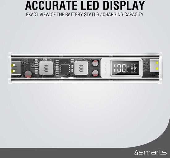 Met de 4smarts Lucid Block powerbank kun je je smartphone of tablet zeer snel opladen. Deze powerbank heeft een capaciteit van 20.000 mAh en kan tot 3 apparaten tegelijk opladen met een vermogen van maximaal 100W. Wanneer je de USB-C poort exclusief gebruikt, kun je opladen met 100W, waardoor je een laptop of MacBook snel van stroom kunt voorzien. Deze powerbank ondersteunt snelladen met technologieën zoals Power Delivery en Quick Charge, zodat je batterij in een mum van tijd volledig is opgeladen. Het LED digitale scherm toont het batterijpercentage, zodat je kunt zien wanneer het tijd is om op te laden. Opladen kan via de USB-C poort met de bijgeleverde 100W USB-C kabel van 50 cm.