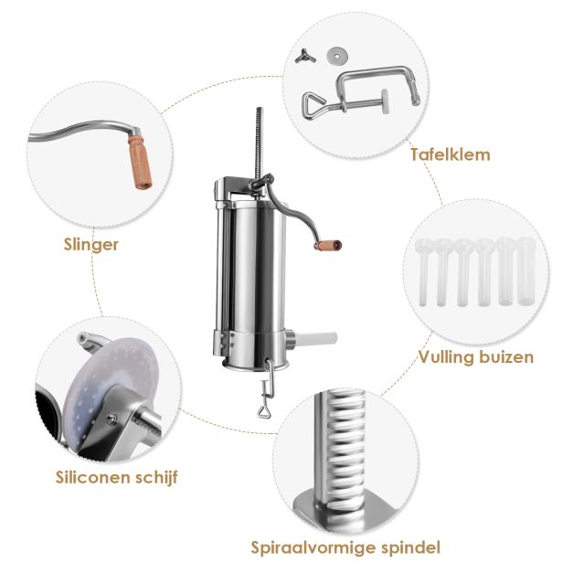 5 kg Manuele RVS Worstenvuller met Tafelklem en 6 Vulbuizen