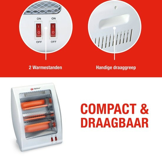 De alpina elektrische kachel is perfect voor elke ruimte in huis. De bijverwarming is compact, draagbaar en heeft een handige handgreep, waardoor je hem gemakkelijk verplaatst. De afmetingen van de kwartskachel zijn 27,5 x 12,5 x 48 centimeter. Zet hem in je kantoor wanneer je thuiswerkt of buiten op de veranda om bij kouder weer toch van de buitenlucht te blijven genieten.