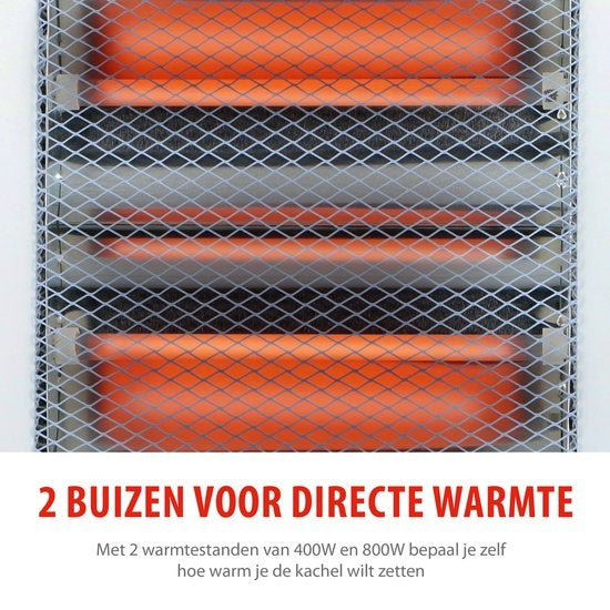 De alpina elektrische kachel is uitgerucht met twee verwarmingsbuizen die veilig achter een rooster geplaatst zijn. Zodra je de verwarming aan zet worden deze buiten verwarmd en geven ze vrijwel direct warmte af. Met 2 warmtestanden van 400W en 800W bepaal je zelf hoe warm je de kachel wilt zetten. Je schakelt deze warmtestanden gemakkelijk in via de aan-/uitknoppen onderaan de verwarming. Een knop voor 400W en twee knoppen voor 800W.