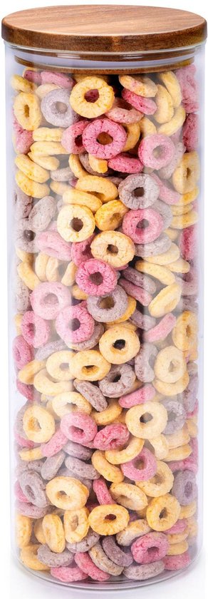 Deze bewaarpot van Alpina is niet alleen functioneel met een royale capaciteit van 1650 ml, maar ook een echte blikvanger. Het doorzichtige glas laat je direct zien wat erin zit. Hierdoor kan deze pot zowel dienen als opslagoplossing als decoratief element. Vul hem bijvoorbeeld met gedroogde bloemen of zand met schelpen en stenen, en plaats hem op de vensterbank. De mogelijkheden zijn eindeloos! Na gebruik kan de voorraadpot in de vaatwasser, aangezien deze vervaardigd is van borosilicaatglas. Dit type glas is veiliger dan kristalglas en bestand tegen hitte. De deksel, gemaakt van accaciahout, is een duurzaam en stijlvol materiaal, dat lang mee gaat. Plaats de deksel niet in de vaatwasser; maak deze indien nodig schoon met een (vochtige) doek.