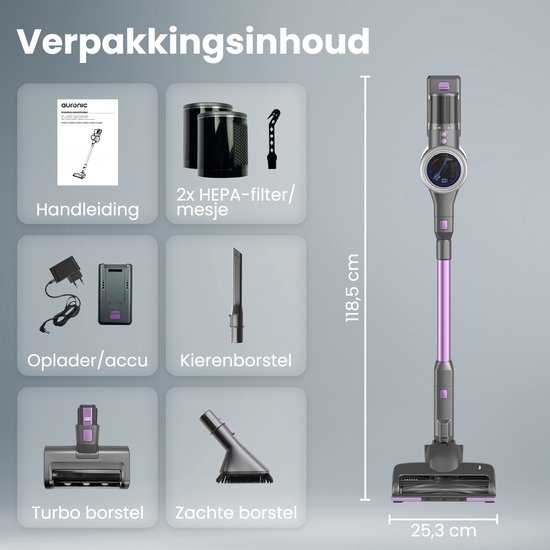 Auronic Steelstofzuiger – Draadloos & Zakloos – 350W | 30 kPa | 50 min – 123 x 25 x 21 cm – Grijs/Paars