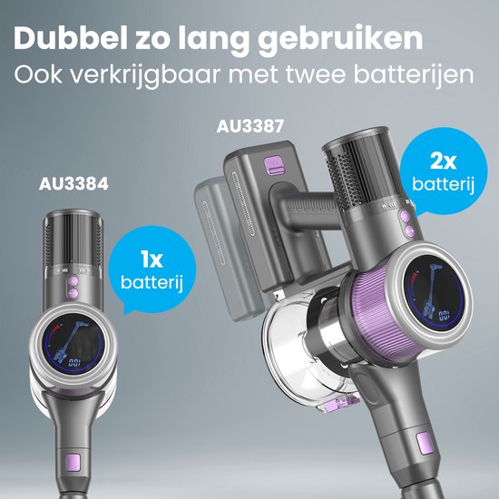 Ervaar langdurig stofzuigen zonder onderbrekingen met de robuuste 4000 mAh accu. In de laagste zuigstand biedt de steelstofzuiger tot 50 minuten gebruik, zodat je probleemloos grote ruimtes kunt reinigen. Maak je geen zorgen over frequent opladen; je hebt genoeg tijd om je hele woning aan te pakken. Afhankelijk van de gekozen zuigstand varieert de batterijduur standaard tussen 50, 30 en 20 minuten voor de lage, gemiddelde en hoge stand. De batterij kan ook afzonderlijk worden besteld; zoek AU3269 in de zoekbalk.