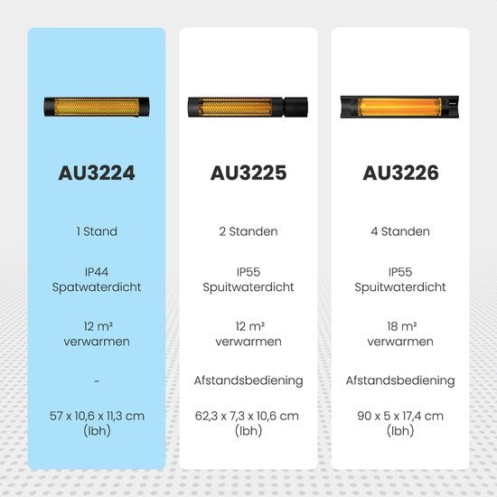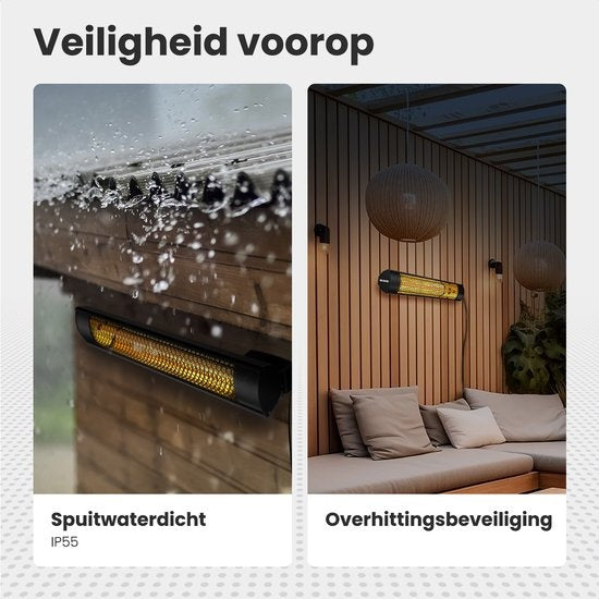 Veiligheid is natuurlijk een belangrijk aspect bij het kiezen van een terrasverwarmer. Daarom is de Auronic Terrasverwarmer uitgerust met oververhittingsbeveiliging, zodat je altijd met een gerust hart kunt genieten van je verwarmde buitenruimte. Het apparaat heeft een IP55 classificatie, wat betekent dat het spatwaterdicht is.