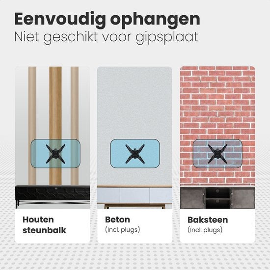 Eenvoudige installatie: Inclusief bevestigingsmaterialen, waterpas en kabelbinders voor een eenvoudige installatie. De beugel is compatibel met betonnen, bakstenen en houten muren (gipswanden worden niet aanbevolen).