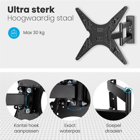 Veelzijdig en flexibel ontwerp: De beugel biedt 360° draaibaarheid (tot 180°), kantelbaarheid van 20°, en de mogelijkheid om de TV tot 48,2 cm van de muur te trekken voor de ideale kijkhoek.